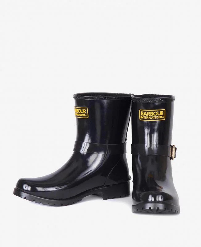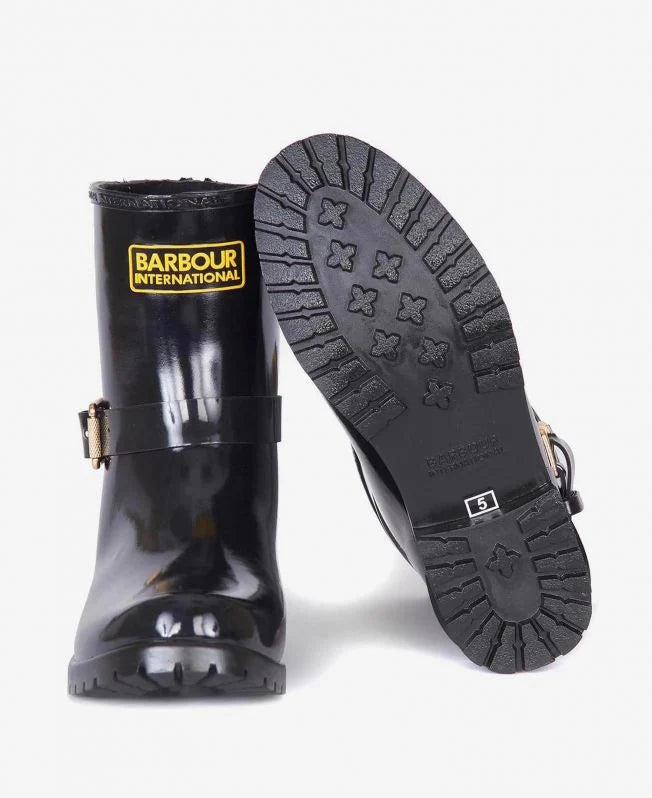 This biker-inspired wellington boot is cut with a low profile and features a zip at the back for easy on/off. A fleece lining delivers superior warmth, while a decorative buckle and rubberised logo badge create the iconic Barbour International look.