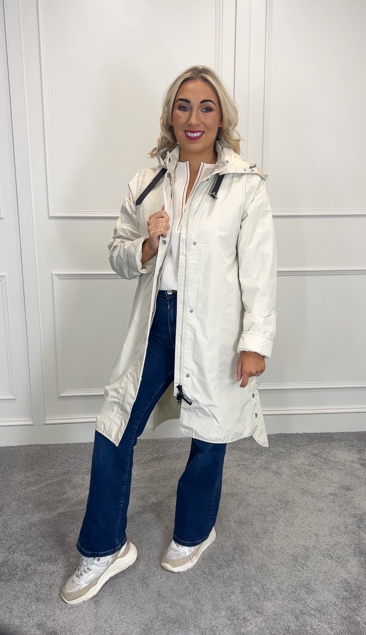 The raincoat has a placket with 2-way YKK zipper and a press buttons opening, side seam pockets with flaps so the water won’t get inside and a detachable hood with an artificial leather strap you can tie when the wind blows.