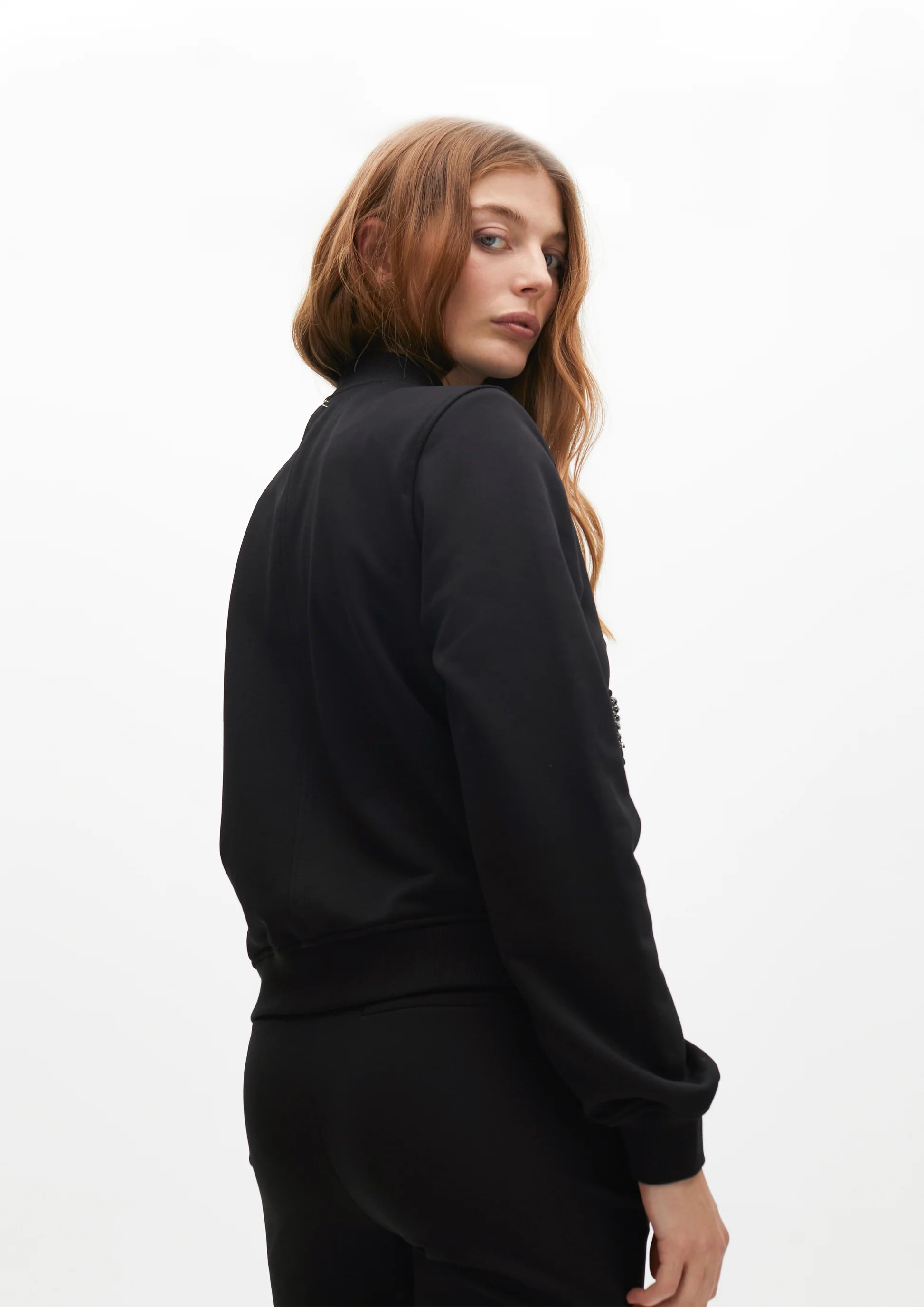 Modern bomber design featuring jewel pocket details. Crafted from soft fabric for added comfort. Button front closure with quality finishes. Perfect for standing out on any occasion.