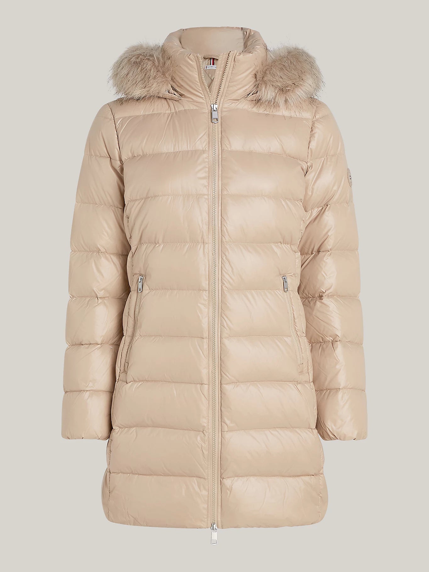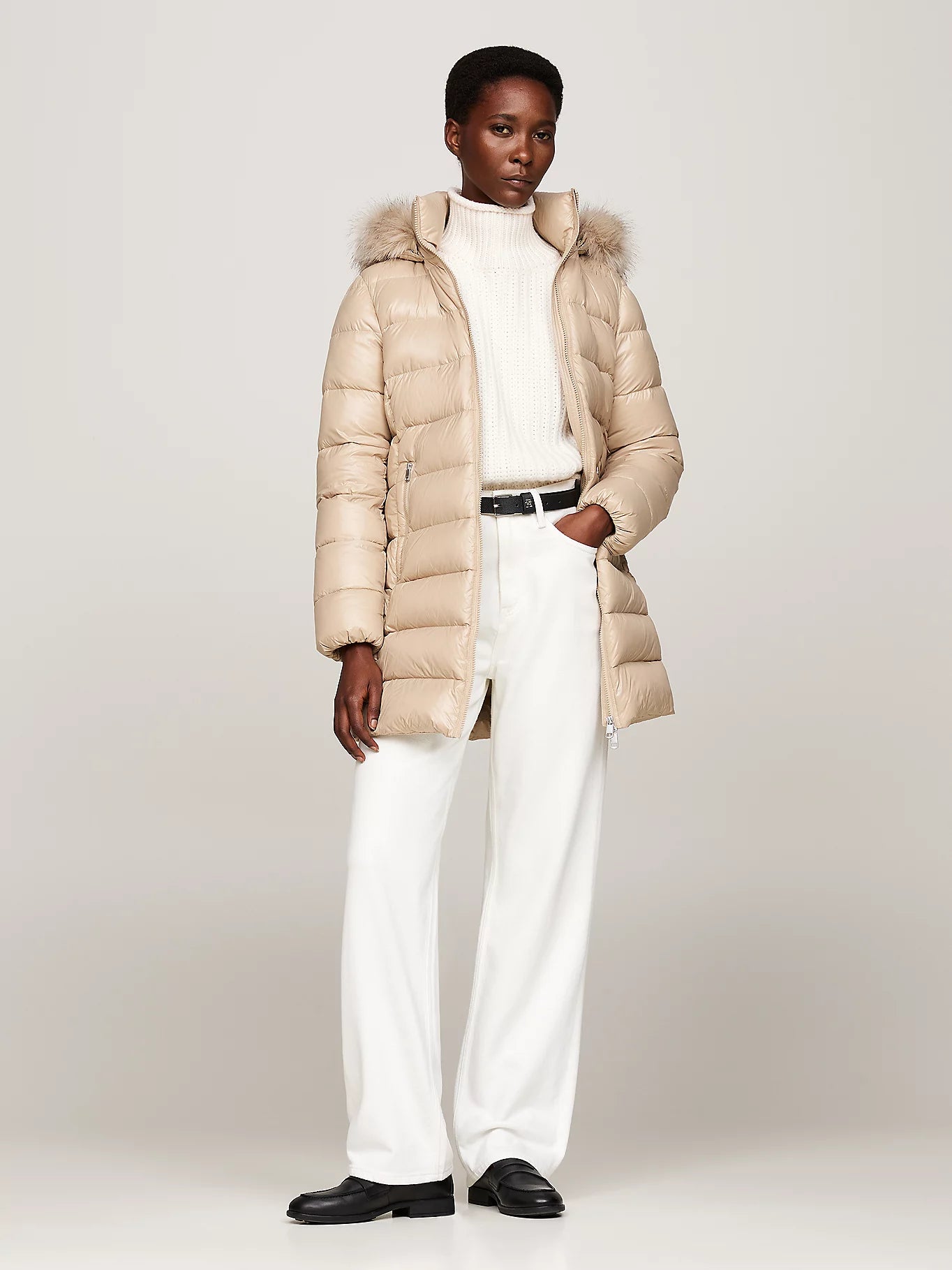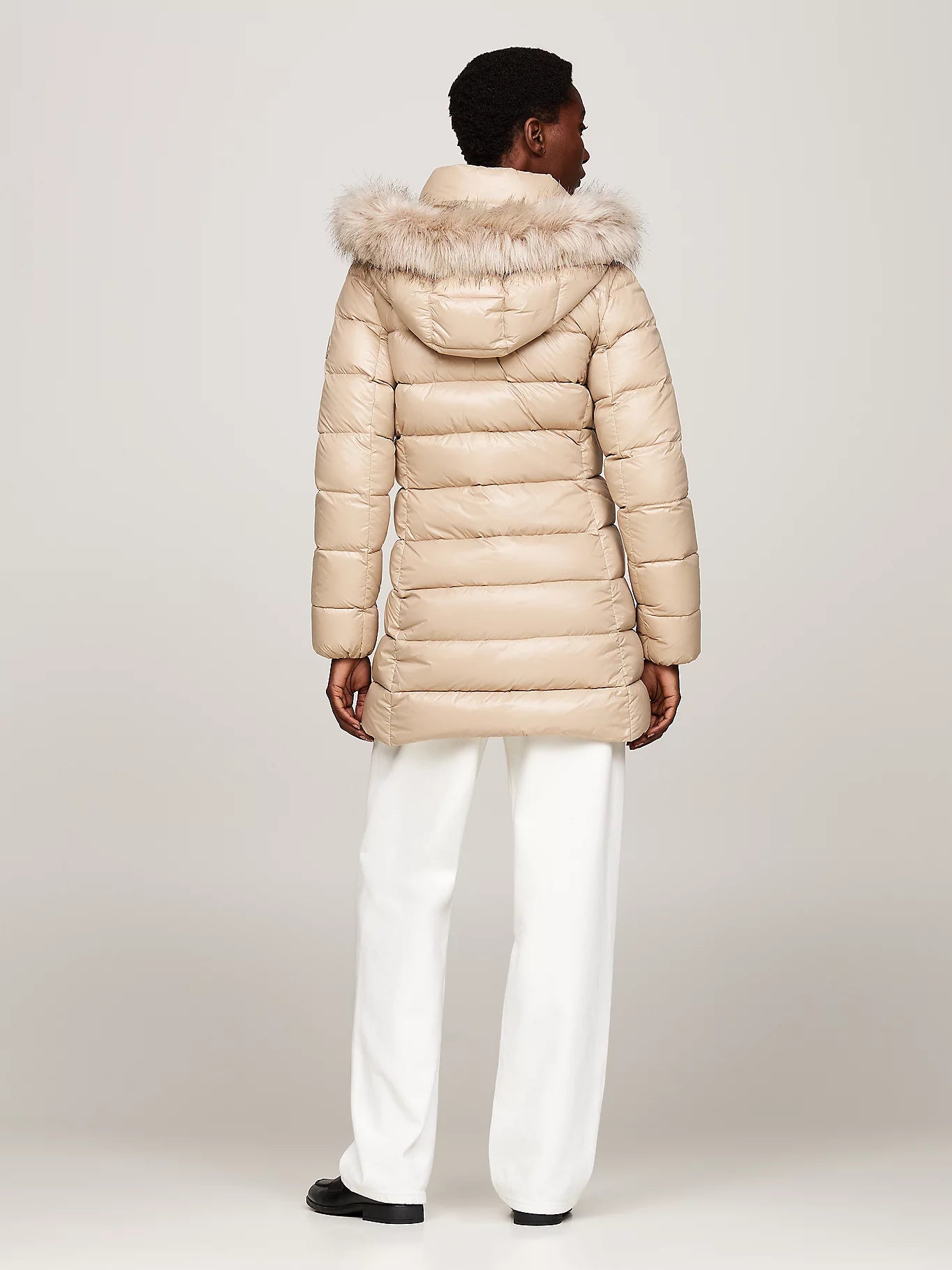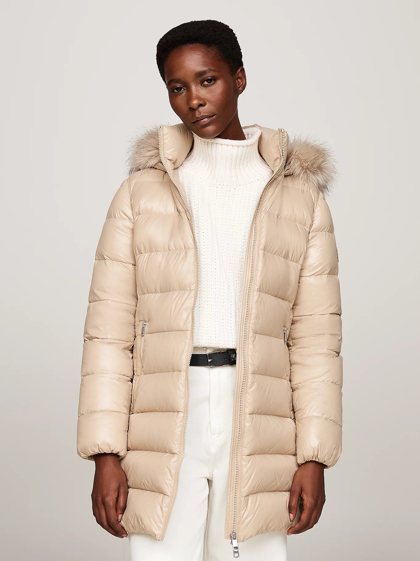 A glossy, water-repellent finish and a removable faux fur trim on the hood amps up the glamour of this practical down-filled coat.